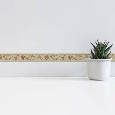 Mit 5 cm Breite eignet sich die Bordüre hervorragend für saubere Übergänge, beispielsweise zwischen Wandflächen, entlang von Kanten oder als feiner Abschluss über Sockel- und Möbellinien. Die matte Oberfläche unterstützt den ruhigen Look, während die strukturierte Ausführung dem Motiv spürbare Tiefe verleiht.