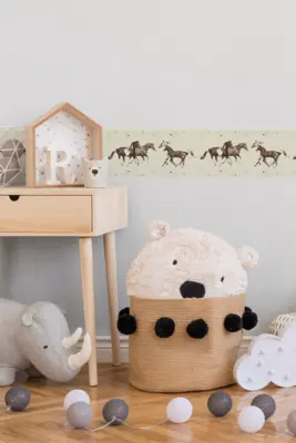 Für den Alltag ist die Bordüre besonders praktisch: Sie ist waschbeständig und gut lichtbeständig, sodass Farben und Details lange erhalten bleiben. Der Rapport ist ansatzfrei – das erleichtert das Anbringen, da kein Musterabgleich nötig ist. Wenn Sie später neu gestalten möchten, lässt sich die Bordüre restlos trocken abziehbar wieder entfernen.