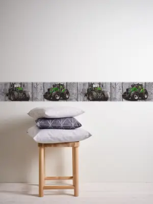 Hersteller: A.S. Création. Herstellernummer: 358431. Ausführung: Tapetenbordüre aus Vlies in Grün/Grau, Holzoptik, matt und glatt. Maße: 5,00 m x 0,13 m. Einsatzgebiet: Kinderzimmer.