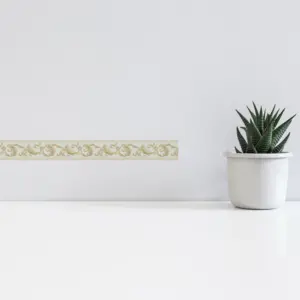 Mit 5,00 m Länge und 0,08 m Breite eignet sich die Bordüre für viele Gestaltungen in Wohnzimmer, Schlafzimmer oder Büro. Ob als Abschluss an Wandflächen, zur Betonung von Übergängen oder als dekoratives Band: Die Kombination aus Gold und Grau harmoniert besonders gut mit klassischen Einrichtungskonzepten.