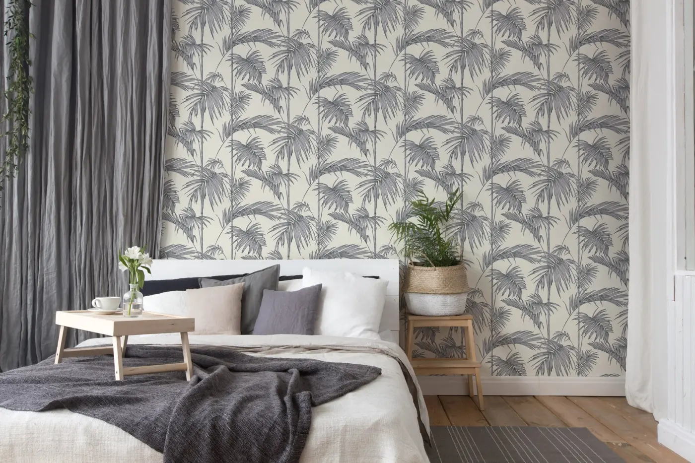 Die Tapete lässt sich restlos trocken abziehen, was sowohl die Anbringung als auch das spätere Entfernen erleichtert. Dank der strapazierfähigen Materialien und der pflegeleichten Eigenschaften eignet sich die Palmentapete ideal für moderne Wohnkonzepte.