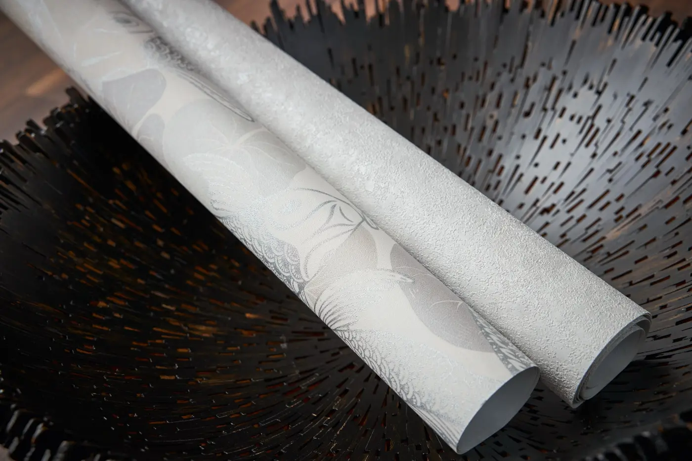Lassen Sie Ihre Wohnräume mit der Vinyltapete 378596 von A.S. Création neu erstrahlen. Das Design in Silber, Weiß und Grau verbindet moderne Optik mit einem Hauch fernöstlicher Ästhetik. Die Tapete beeindruckt durch ihre leicht glänzende Oberfläche und ein geradliniges Rapportmuster von 26 cm, das für einen harmonischen Eindruck sorgt.