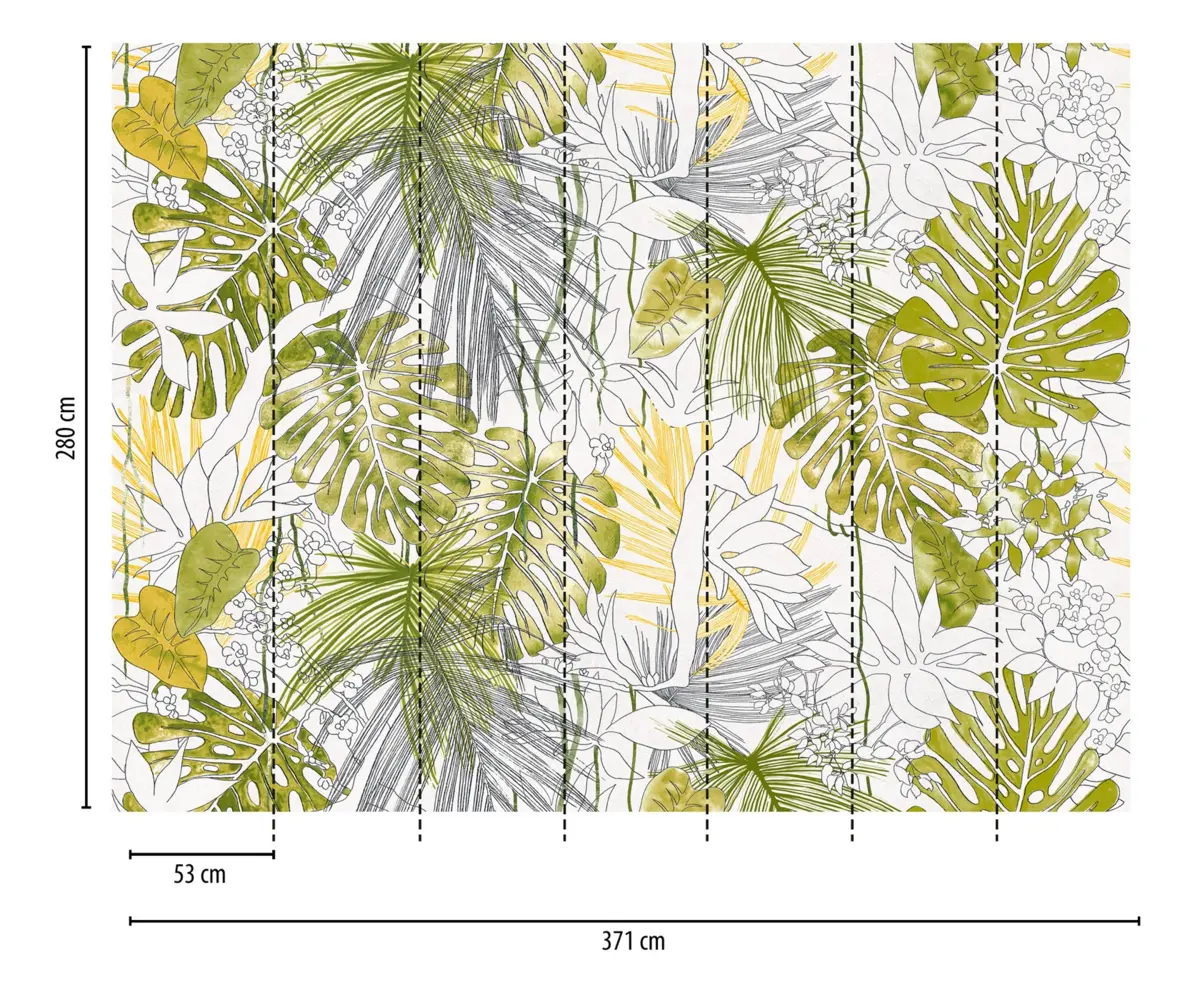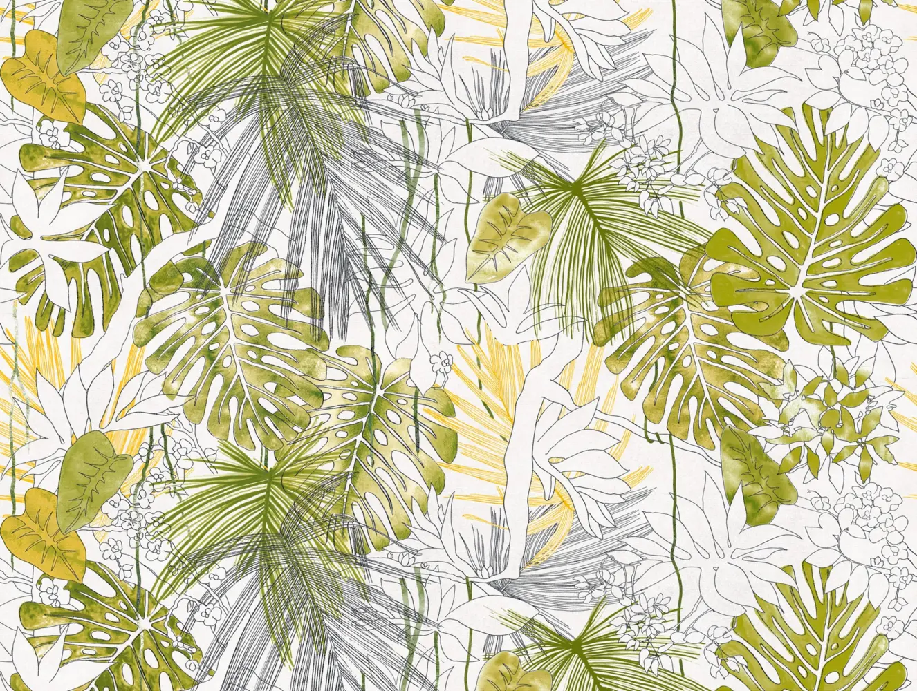Die hochwertige Vinyltapete 382321 von A.S. Création verbindet modernes Design mit einer exotischen Dschungel-Optik in Grün, Weiß, Grau und Gelb. Sie überzeugt durch ihr mattes Finish und eine glatte Struktur, die hochwertige Akzente in jedem Raum setzt. Mit den großzügigen Maßen von 3,71 m x 2,80 m eignet sich diese Tapete ideal für verschiedenste Einsatzgebiete wie Wohnzimmer, Schlafzimmer, Küche, Büro oder auch das Badezimmer.