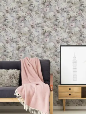 Der versetzte Rapport von 64/32 cm ermöglicht abwechslungsreiche Wandgestaltungen ohne sichtbare Übergänge. Diese Vinyltapete kombiniert funktionale Vorteile mit einem modernen floralen Stil für ein harmonisches Wohnambiente.