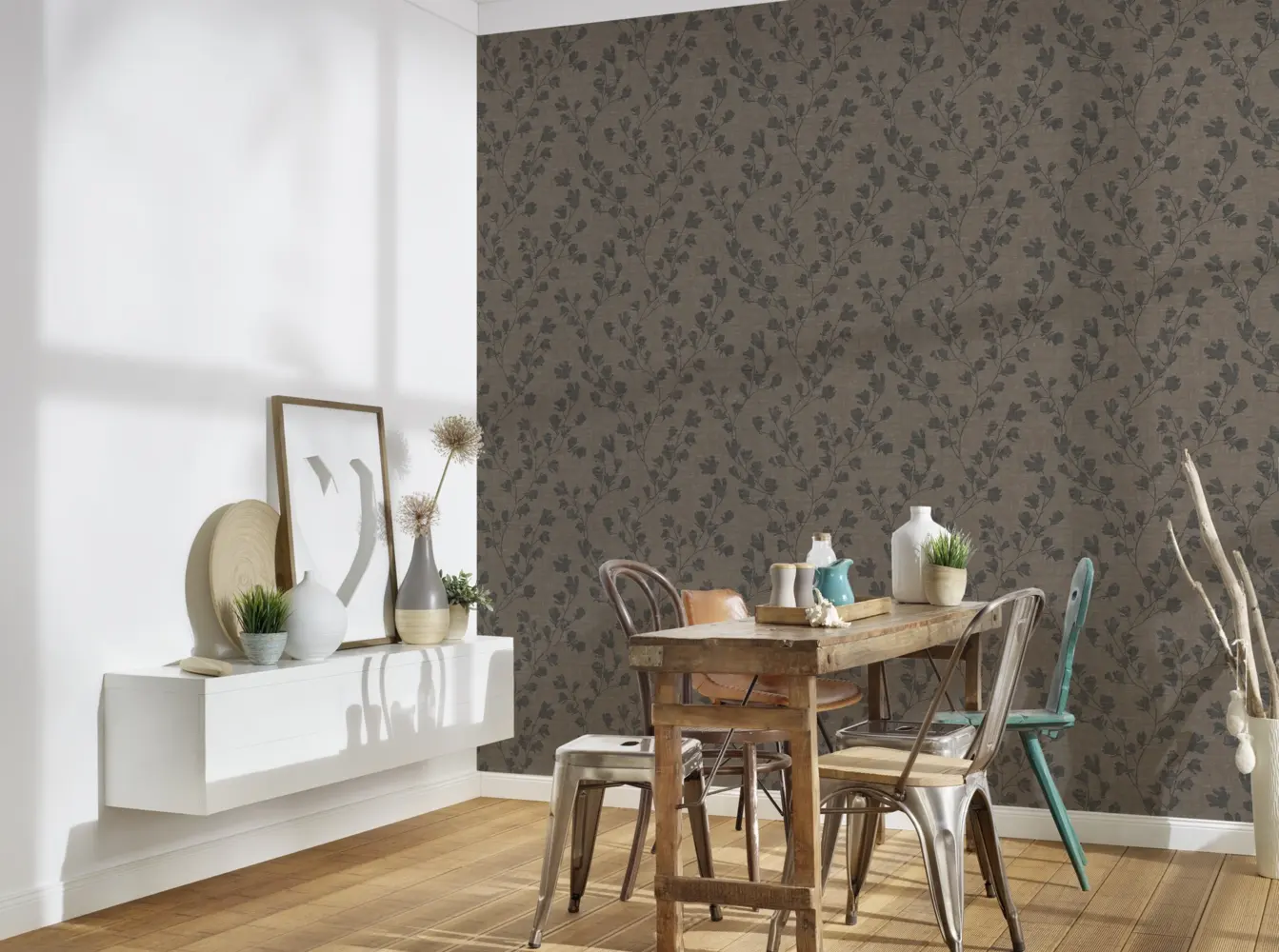 Der moderne florale Stil macht aus dieser Tapete ein echtes Highlight für jede Inneneinrichtung. Die Kombination aus dezentem Grau und Akzenten in Schwarz verleiht Ihren Räumen eine zeitlose Eleganz. Mit ihrem unkomplizierten Handling und der attraktiven Optik ist diese Vinyltapete eine ideale Wahl für anspruchsvolle Gestaltungsprojekte.
