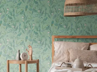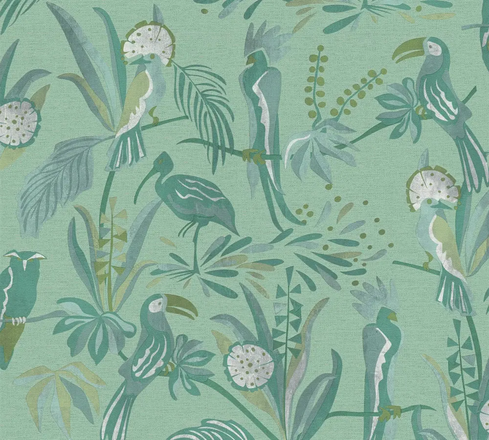 Die Vinyltapete Livingwalls 388982 von A.S. Création verbindet dekoratives Design mit funktionalen Eigenschaften. Das Motiv zeigt ein modernes Vogel-Design in Grün, Weiß und Grau, das jedem Raum eine frische und lebendige Atmosphäre verleiht. Die matte, leicht strukturierte Oberfläche sorgt für einen eleganten Look und ein angenehmes Raumgefühl.