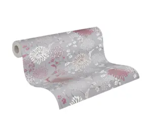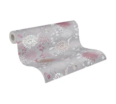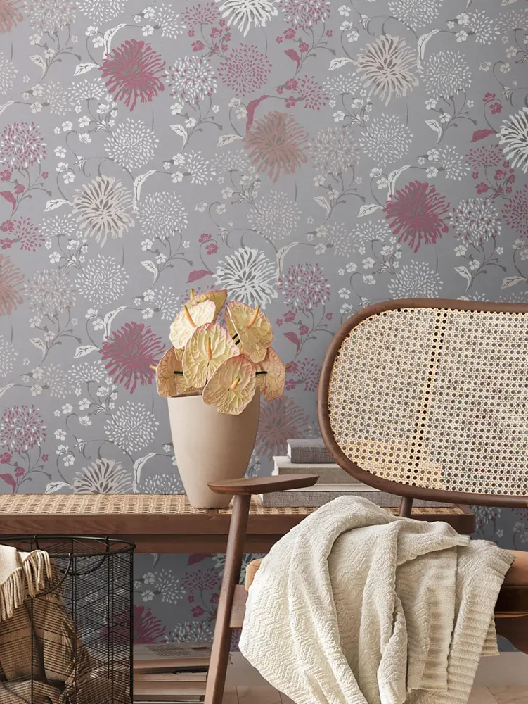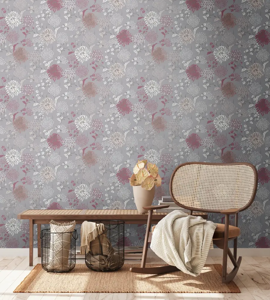 Elegante Vinyltapete in floralem Design – Grau, Weiß, Rot und Violett