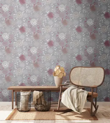 Die ausdrucksstarke Farbpalette in Grau, Weiß, Rot und Violett bringt florale Akzente an die Wand und unterstreicht unterschiedlichste Wohnstile. Das versetzte Rapportmaß von 53/26 cm sorgt für ein harmonisches Gesamtbild ohne sichtbare Übergänge.