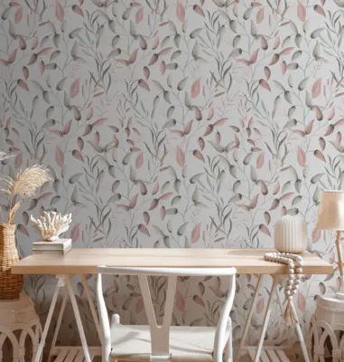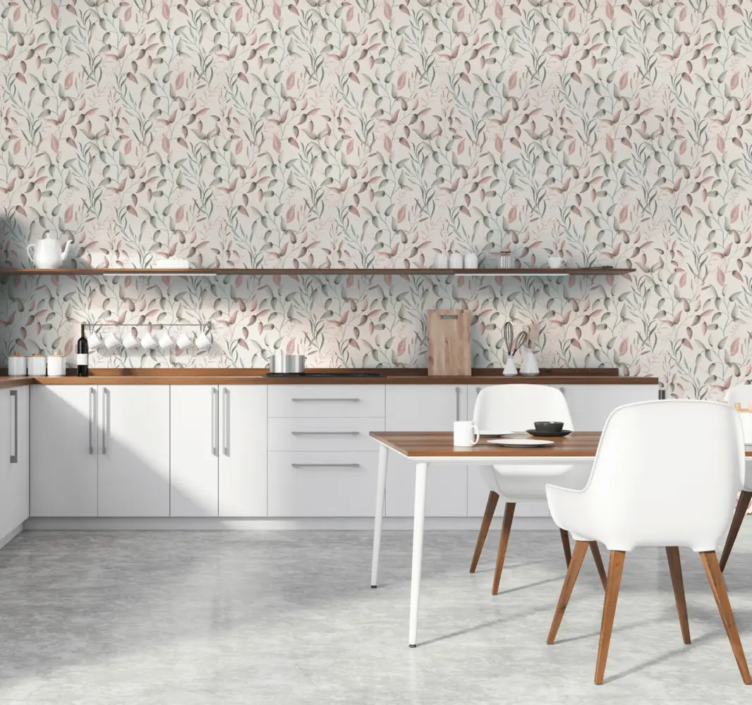 Mit ihrem eleganten Blumen- und Blättermotiv setzt diese Vinyltapete stilvolle Akzente und bringt Frische sowie Natürlichkeit in jeden Raum.
