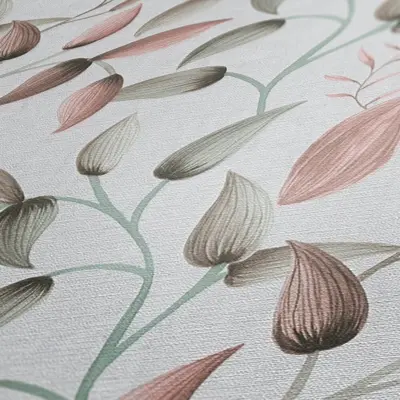 Die Vinyltapete 397451 von A.S. Création verbindet ein zeitloses florales Design mit modernen Farben in Grün, Rosa und Creme. Ihr dekoratives Blätterranken-Muster und die matte Oberfläche schaffen ein stilvolles Ambiente für unterschiedliche Wohnbereiche wie Wohnzimmer, Schlafzimmer, Küche, Badezimmer und Büro.