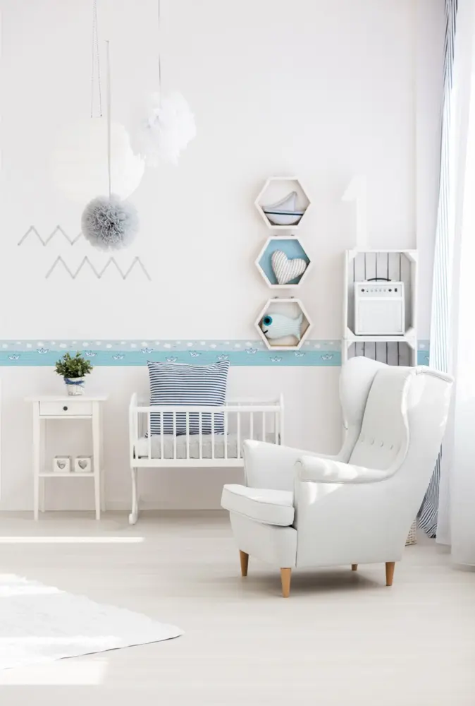 Die Oberfläche ist waschbeständig und damit gut für den Einsatz im Kinderzimmer geeignet. Zusätzlich ist die Bordüre gut lichtbeständig, sodass die Blau-Weiß-Optik auch bei normaler Lichteinwirkung lange sauber und frisch wirkt. Für spätere Veränderungen lässt sie sich restlos trocken abziehen.