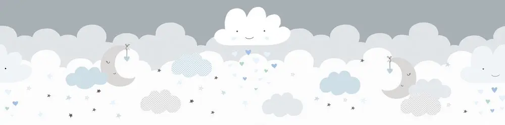Hersteller: A.S. Création. Herstellernummer: 403744. Material: selbstklebendes Papier. Maße: 5,00 m x 0,155 m (Breite 15,5 cm). Farben/Optik: Grau, Blau, Weiß. Einsatzgebiet: Kinderzimmer.