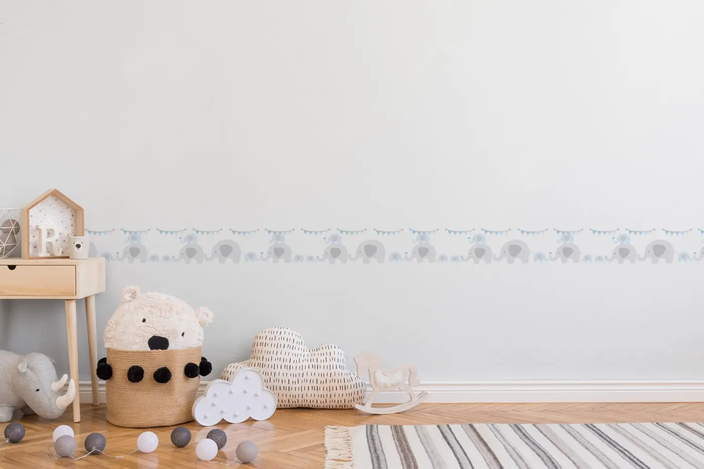 Mit der A.S. Création Tapetenbordüre 403748 gestalten Sie Kinderzimmerwände schnell, sauber und harmonisch. Die Farbgebung in Blau, Grau und Weiß wirkt modern und zugleich beruhigend – ideal, um einzelne Bereiche wie Bett, Wickelplatz oder Spielecke dezent zu betonen.