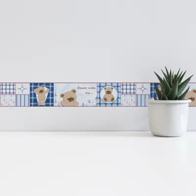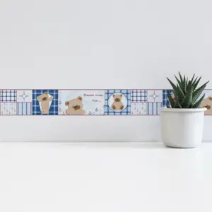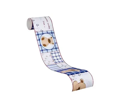 Als Trägermaterial wird Papier verwendet, kombiniert mit SK-Folie für eine widerstandsfähige, alltagstaugliche Oberfläche. Die matte Optik unterstützt ein harmonisches Gesamtbild, das besonders gut zu typischen Kinderzimmer-Stilen passt. Mit einem Gewicht von ca. 0,1 kg pro Stück bleibt die Bordüre zudem angenehm handlich.
