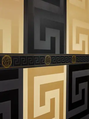 Die Versace Wallpaper Bordüre 935224 von A.S. Création setzt mit ihrem edlen Schwarz-Gold-Design ein klares Statement und verleiht Räumen eine luxuriöse, moderne Ausstrahlung. Als dekorativer Abschluss an Wandkanten, als Rahmen für einzelne Wandflächen oder als gezielter Blickfang über Möbeln sorgt die Bordüre für Struktur und ein harmonisches Gesamtbild.