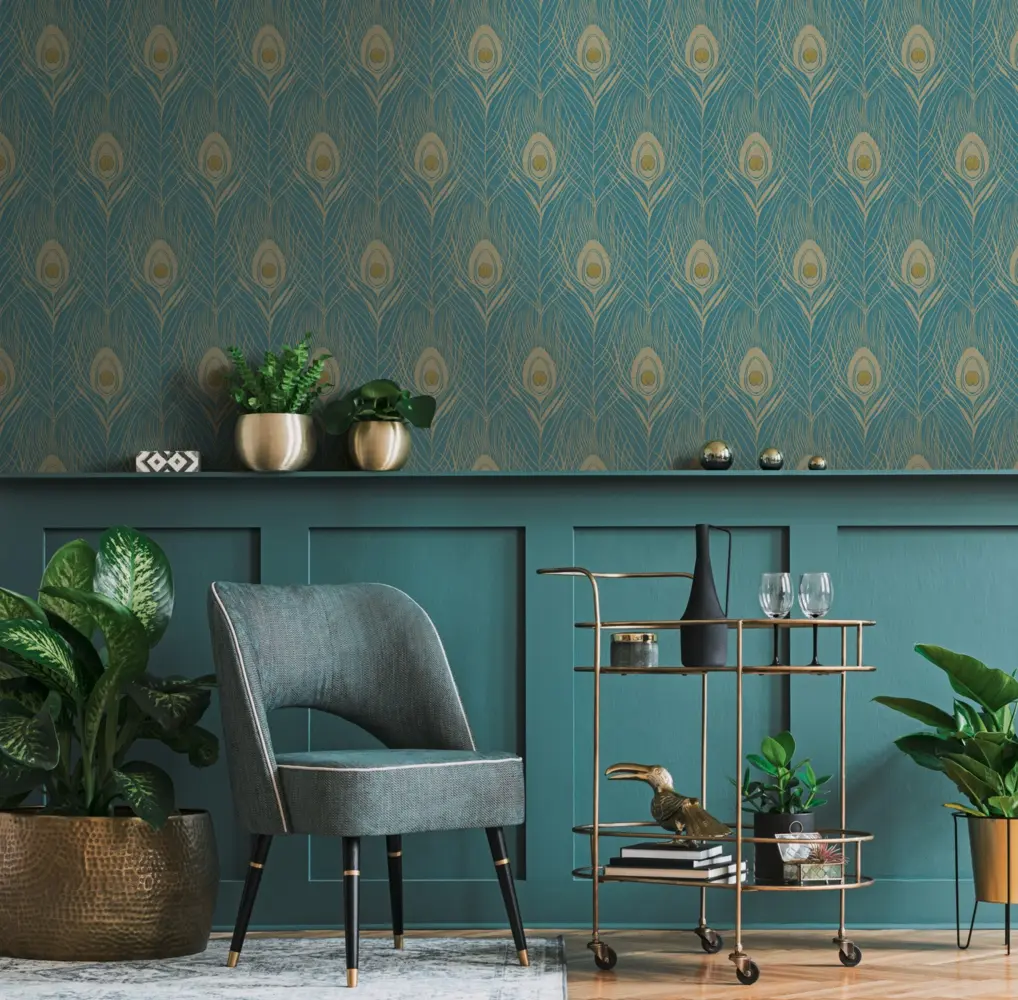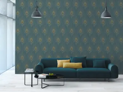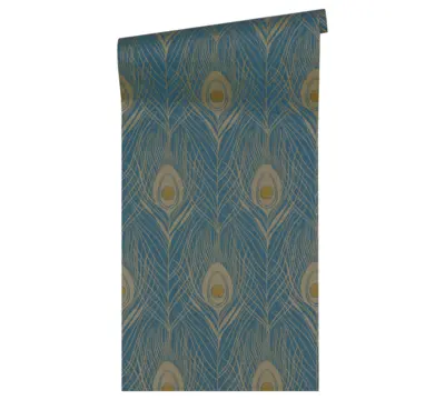 Die Vinyltapete aus der Kollektion Absolutely Chic von A.S. Création vereint stilvolles Design und hochwertige Verarbeitung. Das eindrucksvolle Feder-Motiv in Blautönen mit goldenen und gelben Akzenten setzt besondere Glanzpunkte an jeder Wand. Durch die leicht glänzende Oberfläche entsteht ein dezenter Schimmer, der dem Raum eine exklusive Atmosphäre verleiht.