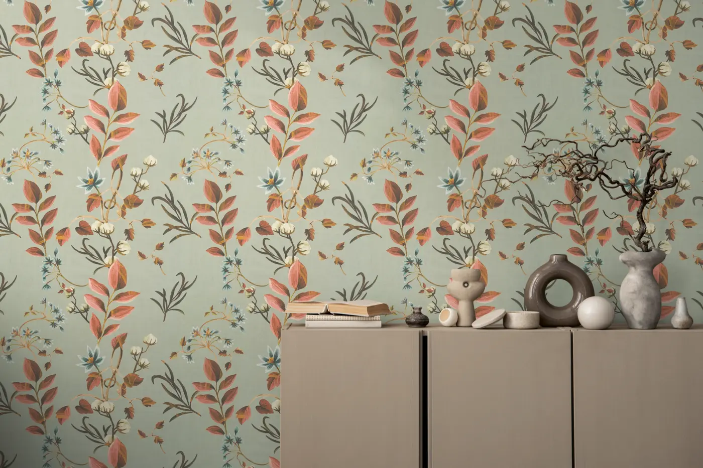 Mit einem geraden Rapport von 53 cm lässt sich das florale Design Bahn für Bahn sauber fortführen. So entsteht ein ruhiger, durchgängiger Mustereindruck, der Flächen optisch ordnet und elegant wirken lässt.