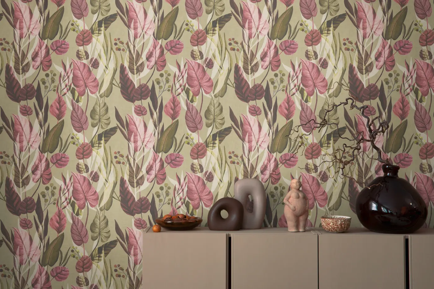 Die natürlichen Grün- und Brauntöne harmonieren besonders gut mit Holz, Naturtextilien und zurückhaltenden Uni-Farben. In Kombination mit matten Oberflächen und dezenten Accessoires wirkt das Blättermotiv modern, ruhig und zugleich dekorativ.
