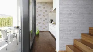 Das versetzte Rapportmaß von 64/32 cm unterstreicht die authentische Steinoptik und ermöglicht ein harmonisches Gesamtbild. Die Tapete überzeugt durch ihre Kombination aus moderner Optik, praktischen Eigenschaften und einfacher Handhabung – ideal für anspruchsvolle Wohn- und Lebensräume.