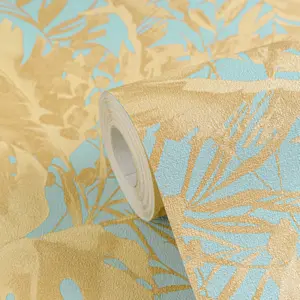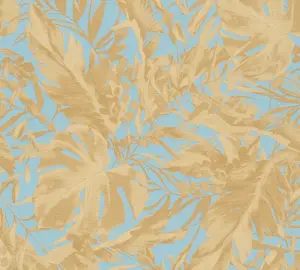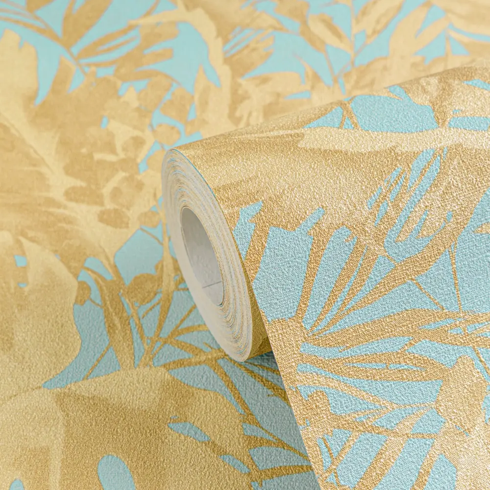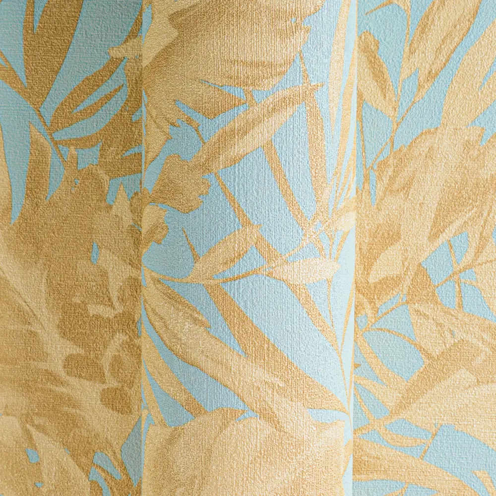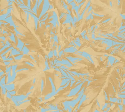 Die A.S. Création CosmoLiving Tapete 790632 setzt mit ihrem tropischen Botanic-Motiv aus Dschungel- und Palmenblättern einen ausdrucksstarken Akzent an Wand und Decke. Die Kombination aus blauen Flächen und goldenen Details wirkt elegant und modern zugleich, während die matte Oberfläche und die leicht strukturierte Haptik dem Dessin zusätzliche Tiefe verleihen.