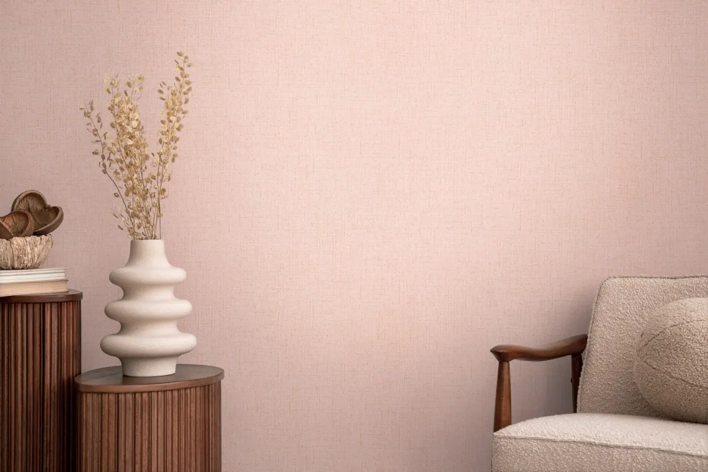 Die Tapete ist als Vliestapete mit Vinyl-Oberfläche aufgebaut und besitzt eine strukturierte Haptik. In Rosa mit Metallic-Optik wirkt sie je nach Lichteinfall mal dezent, mal ausdrucksstark und setzt ruhige, elegante Akzente an Wand und Decke. Die Lichtbeständigkeit ist gut, sodass die Farbwirkung langfristig erhalten bleibt.