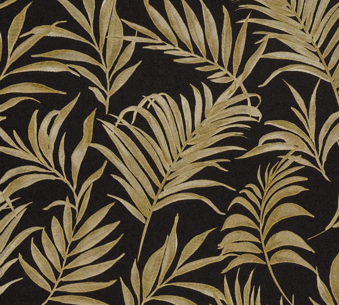 Die A.S. Création CosmoLiving Tapete 791086 setzt mit ihrem tropisch-floralen Look starke Akzente: Schwarzer Grund trifft auf goldene Details und erzeugt eine elegante, moderne Raumwirkung. Durch das Zusammenspiel aus matter und glänzender Oberfläche wirkt das Dessin lebendig und bekommt je nach Lichteinfall zusätzliche Tiefe.