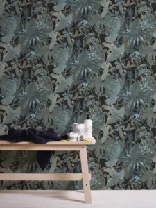 Die A.S. Création Desert Lodge Vinyltapete 385222 verleiht Ihren Wänden mit ihrem ausdrucksstarken Dschungel-Design und einer modernen Farbkombination aus Türkis, Schwarz, Blau und Grün eine faszinierende Atmosphäre. Inspiriert von exotischer Natur bringt sie einen Hauch von Abenteuer in Ihre Wohn- oder Arbeitsräume.