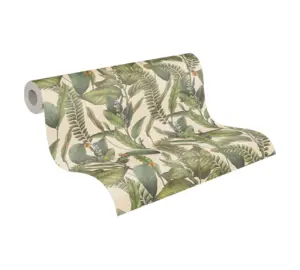 Verwandeln Sie Ihre Räume mit der A.S. Création Vinyltapete aus der Kollektion "Drawn Into Nature" in eine stilvolle Oase. Diese Tapete begeistert durch ein harmonisches Dschungelmotiv in sanften Creme-, Grün- und Orangetönen und sorgt für ein edles, mattes Finish. Die zarte Struktur unterstreicht das natürliche Design und verleiht Wänden und Decken einen modernen, lebendigen Look.