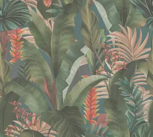 Die Vinyltapete Drawn Into Nature von A.S. Création vereint exotische Dschungeloptik mit modernen Farbtönen in Blau, Petrol, Grün, Beige und Rot. Diese hochwertig verarbeitete Tapete misst 10,05 Meter in der Länge und 53 Zentimeter in der Breite. Ihr mattes, leicht strukturiertes Finish verleiht jedem Raum eine stilvolle und natürliche Atmosphäre.