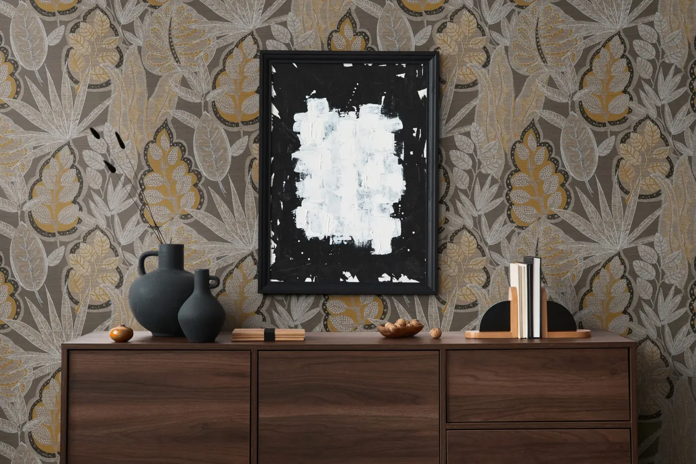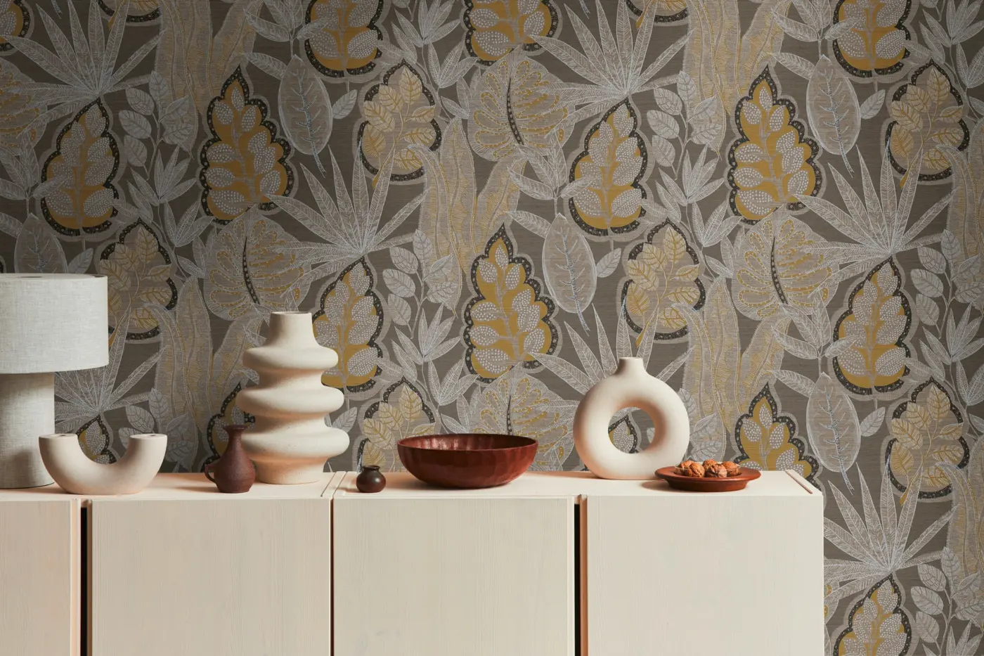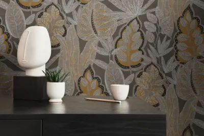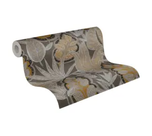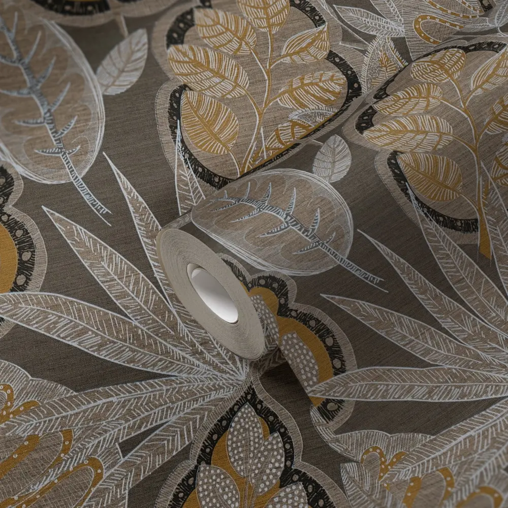 Die Vinyltapete „Famous Garden 393463“ von A.S. Création kombiniert stilvolle Braun- und Orangetöne mit einem ausdrucksstarken floralen Blättermotiv. Durch die matte Oberfläche und die leichte Struktur entsteht eine edle und moderne Wohnatmosphäre, die vielseitig einsetzbar ist – ob im Wohnzimmer, Schlafzimmer, Büro oder in der Küche.