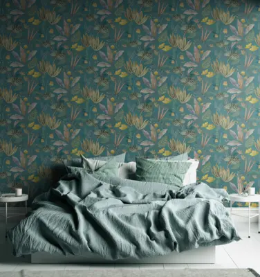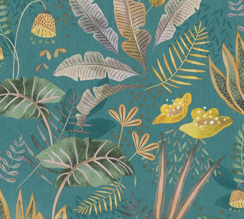 Die Vinyltapete 393483 aus der Kollektion Famous Garden von A.S. Création bringt mit ihrem floralen Muster eine erfrischende Natürlichkeit in Ihre Räume. Das harmonische Zusammenspiel von Petrol, Grün, Gelb und Grau verleiht Wänden im Wohn-, Schlaf-, Büro- oder Küchenbereich eine lebendige und dennoch elegante Atmosphäre.