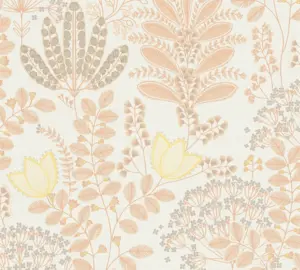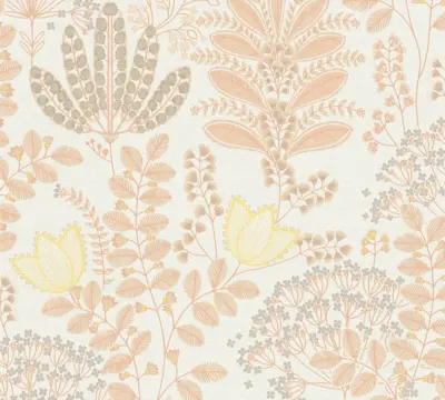 Der versetzte Rapport von 53/26 cm sorgt für einen dynamischen und natürlichen Look. Die Farben Weiß, Orange und Gelb schaffen eine freundliche Atmosphäre und lassen sich vielseitig kombinieren. Dank der modernen Blumen-Optik ist diese Tapete ideal, um jedem Raum eine besondere Note zu verleihen.