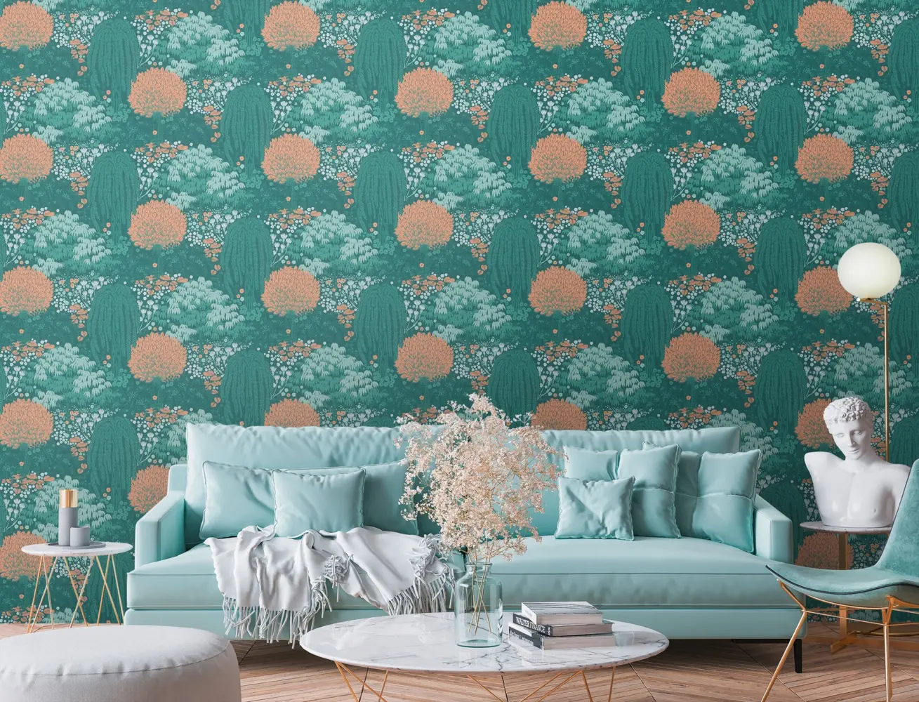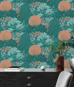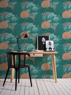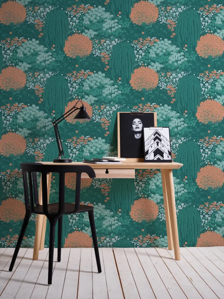 Die Vinyltapete 393503 aus der Kollektion Famous Garden von A.S. Création verleiht Ihren Räumen ein modernes und natürliches Ambiente. Das besondere Waldmotiv in harmonischen Petrol-, Orange- und Grüntönen bringt Frische und Lebendigkeit an die Wand und setzt trendige Akzente.