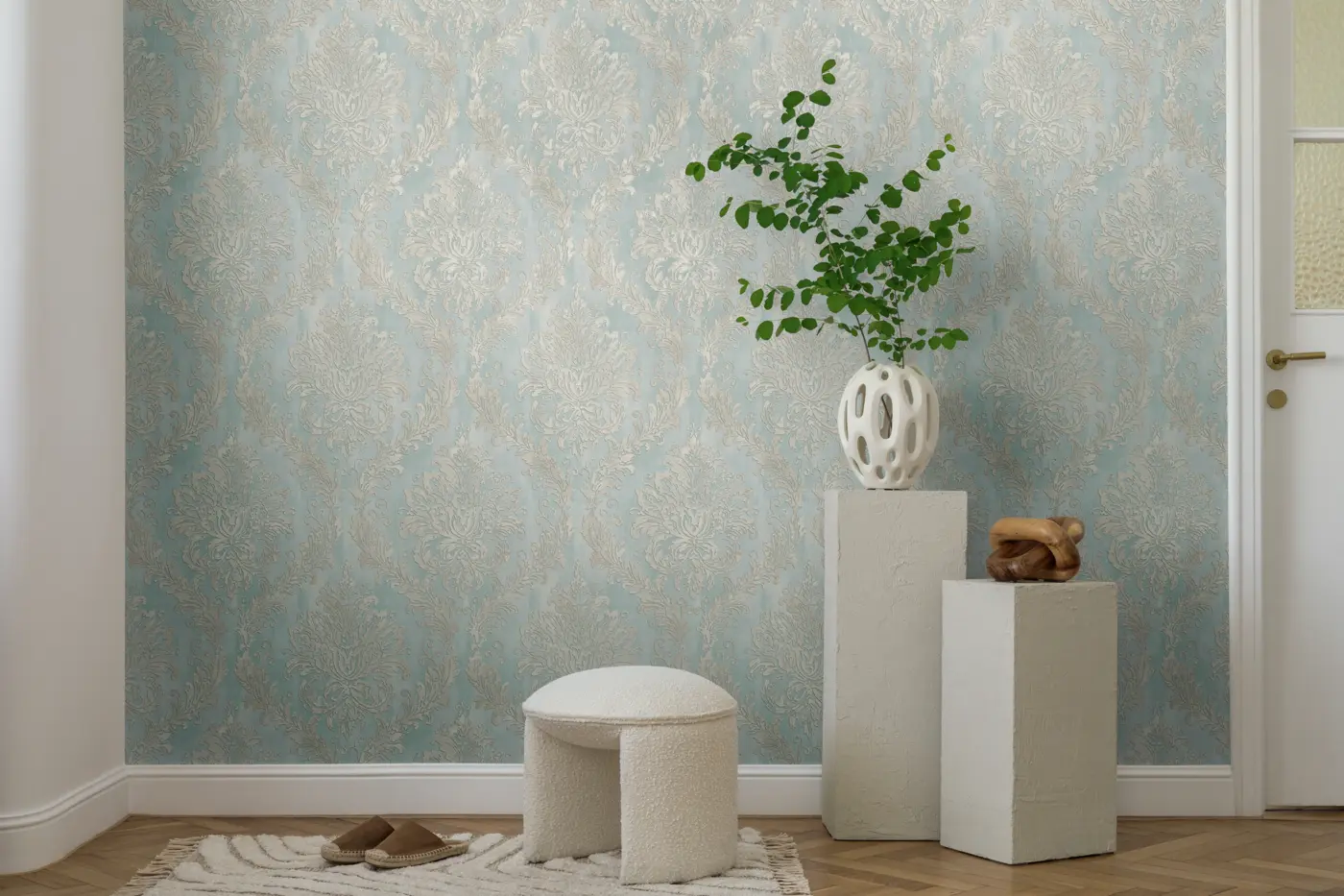 Als Vinyl-Tapete auf Vlies-Träger verbindet sie eine hochwertige Optik mit alltagstauglicher Robustheit. Die Oberfläche ist leicht strukturiert und kombiniert matte & glänzende Partien, wodurch das Muster je nach Lichteinfall lebendig wirkt und Tiefe erhält.