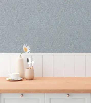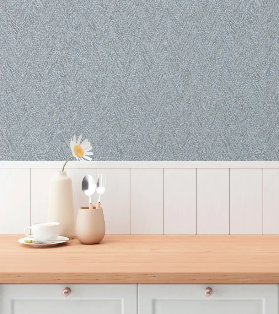 Das Design orientiert sich an Struktur- und Ethno-Elementen mit einer Fischgrät-Anmutung. Dadurch entsteht eine lebendige, aber nicht aufdringliche Wandwirkung, die zu skandinavischen, natürlichen und modernen Einrichtungen passt. Die Kombination aus kühlem Blau und erdigem Braun lässt sich gut mit Holz, Naturfasern sowie unifarbenen Textilien in Beige, Grau oder Creme abstimmen.