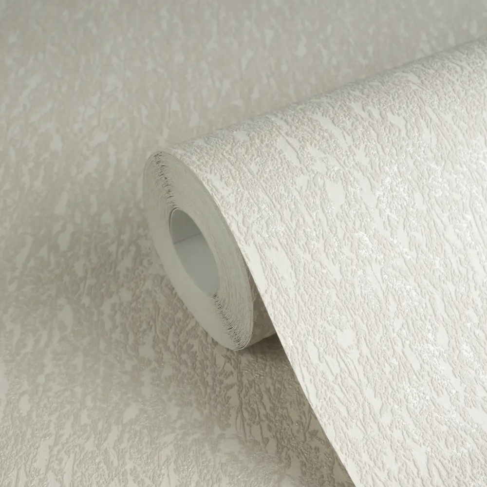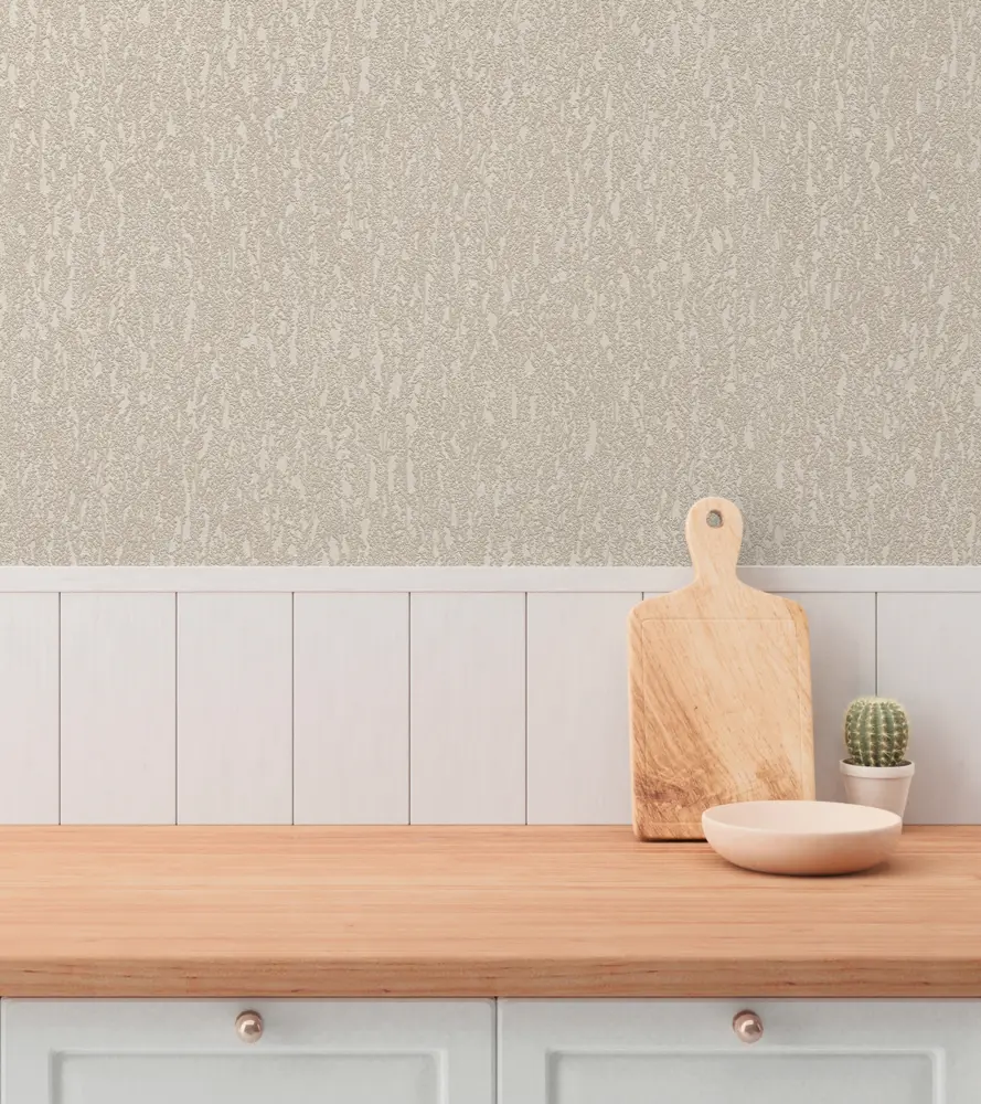 Die Tapete ist strukturiert und verbindet matte mit glänzenden Bereichen. So entsteht eine dezente Tiefenwirkung mit feinen Lichtreflexen, die das Muster je nach Lichteinfall lebendig erscheinen lässt, ohne aufdringlich zu wirken.