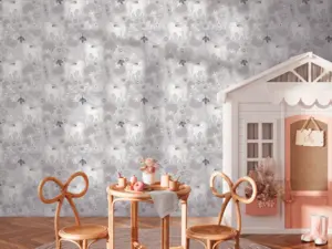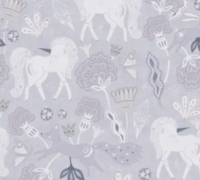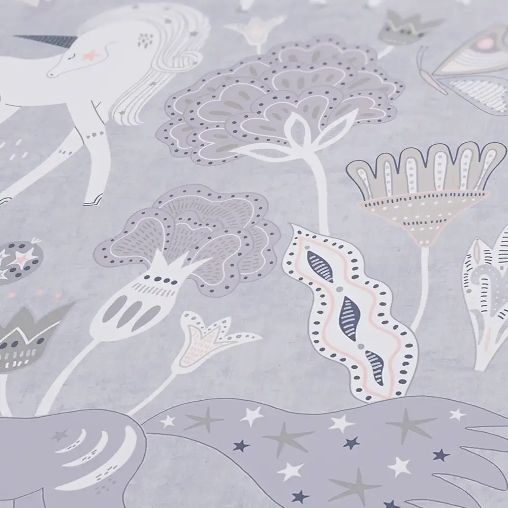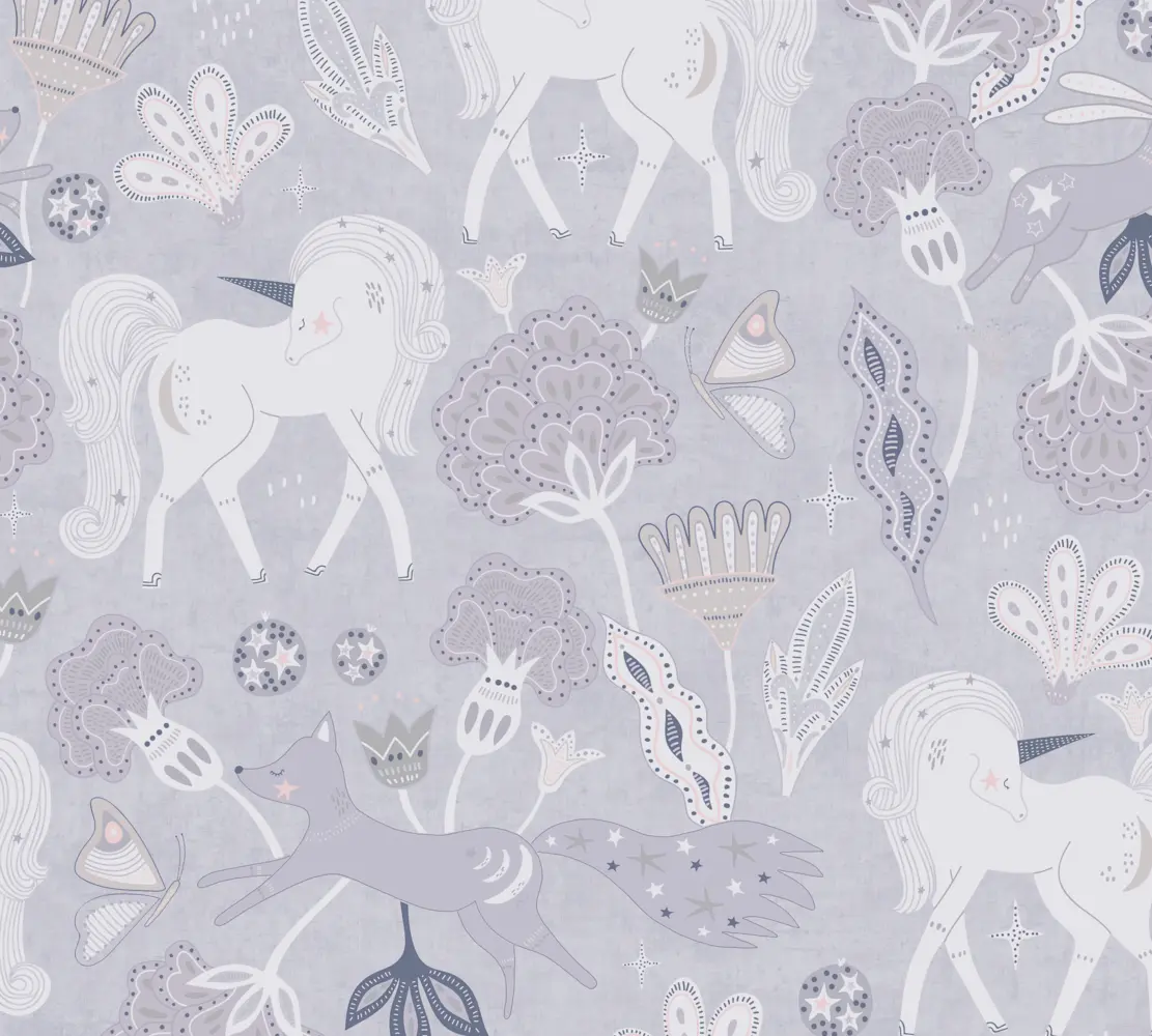 Die A.S. Création Vliestapete 771381 aus der Kollektion Lilly & Luis bringt eine ruhige, kindgerechte Gestaltung an Wand und Decke. Die matte, glatte Oberfläche in Grau und Rosa wirkt modern und freundlich und setzt das Motiv mit Einhorn, Bäumen und Tieren harmonisch in Szene.