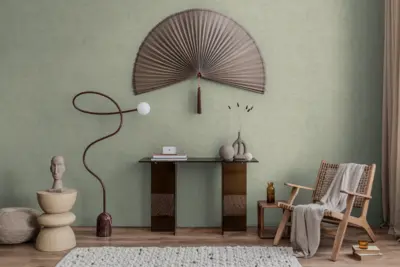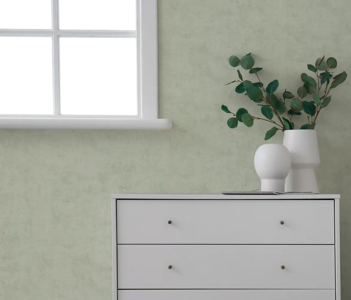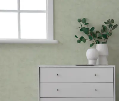 Durch die zurückhaltende Struktur und den grünen Uni-Look eignet sich die Tapete für Wohn- und Schlafzimmer, Flur oder Homeoffice. Sie funktioniert großflächig ebenso überzeugend wie in Kombination mit gemusterten Designs oder natürlichen Materialien.