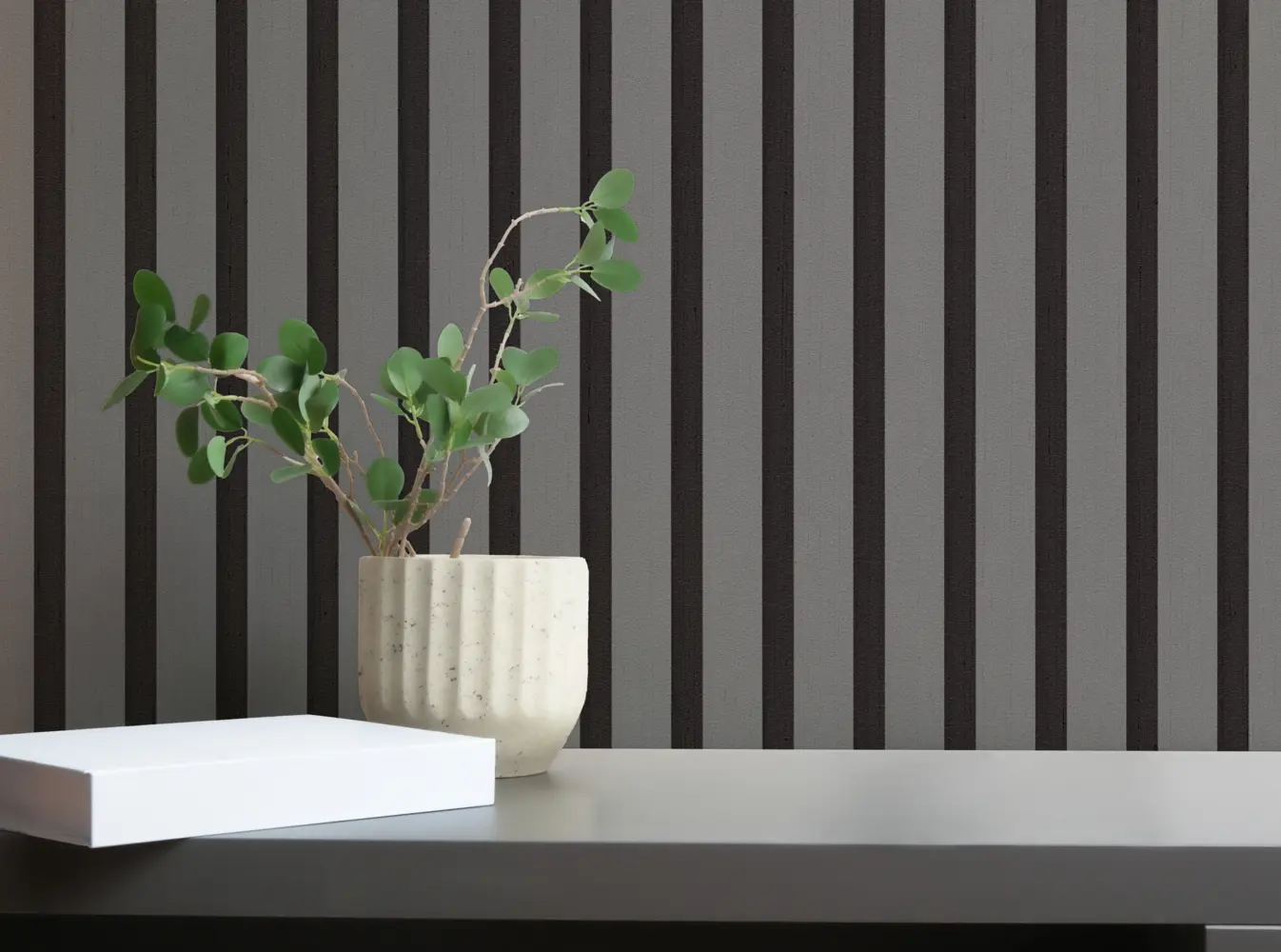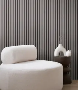 Das Paneel-Design wirkt wie sauber verlegte Holzleisten und bringt Tiefe an die Wand, ohne aufdringlich zu sein. Durch die gedeckte Farbgebung lässt sich die Tapete vielseitig kombinieren, zum Beispiel mit hellen Hölzern, neutralen Textilien oder klaren, dunklen Akzenten.