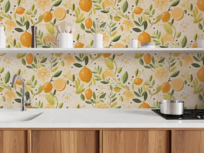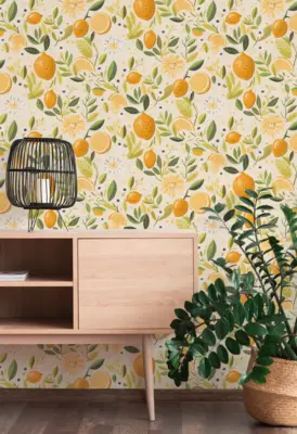 Die A.S. Création Pintwalls III Vliestapete 791692 bringt mit ihrem floralen Zitronenmotiv eine frische, freundliche Atmosphäre an die Wand. Die matte Oberfläche in Creme und Gelb wirkt angenehm dezent, während die leicht strukturierte Vinyl-Oberfläche dem Design spürbare Tiefe verleiht – ideal für Küche, Essbereich oder Wohnräume mit mediterranem Akzent.