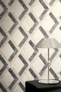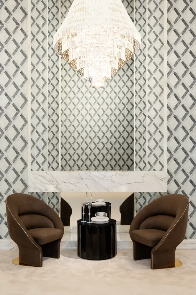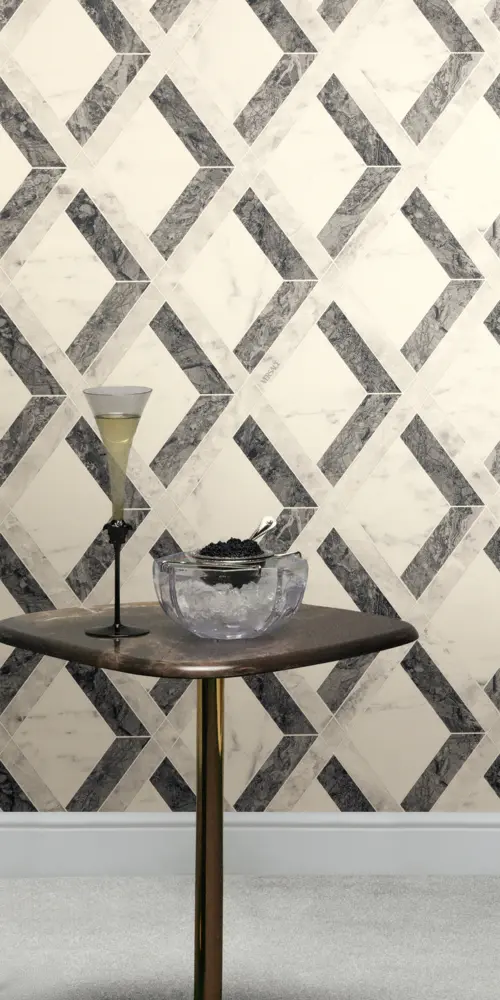 Die matte Oberfläche wirkt edel und zurückhaltend, während die leicht strukturierte Vinyl-Oberfläche zusätzliche Tiefe erzeugt. So kommt das geometrische Muster klar zur Geltung und verleiht dem Raum eine präzise, luxuriöse Anmutung.