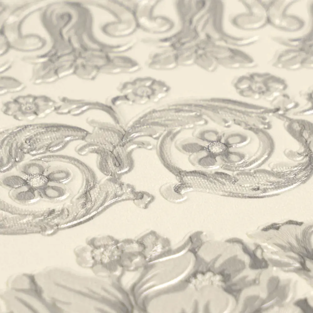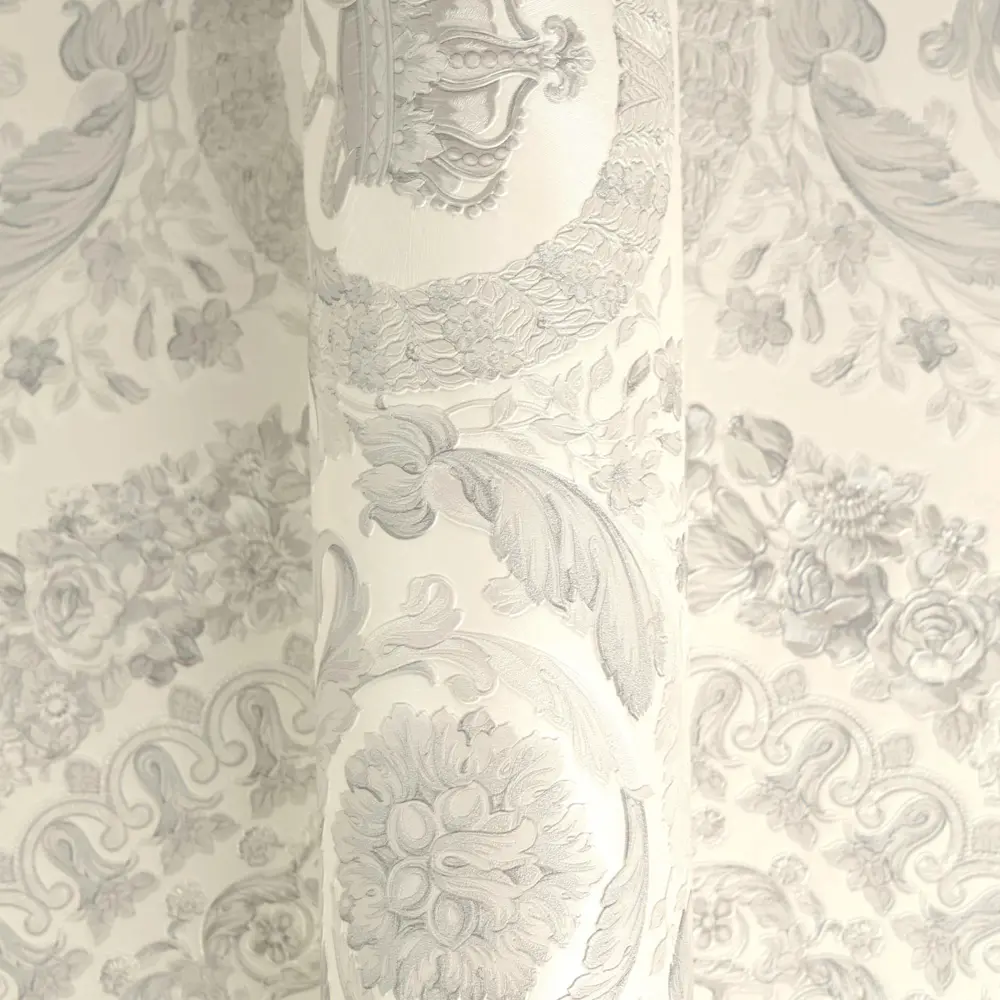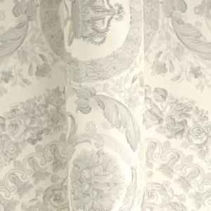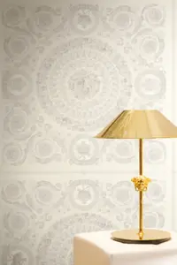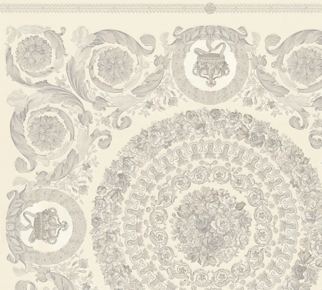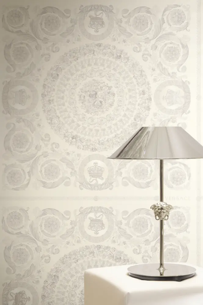 Die A.S. Création Versace 6 Vliestapete 791342 vereint ikonisches Versace-Design mit hochwertiger Verarbeitung für stilvolle Wandgestaltungen. Das barock inspirierte Dessin kombiniert florale Ranken, geometrische Elemente und dezente Versace-Logo-Akzente. In Weiß und Grau wirkt das Gesamtbild besonders elegant und wird durch die leicht glänzende Oberfläche edel unterstrichen.