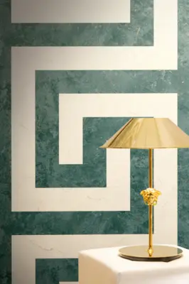 Die A.S. Création Versace 6 Vliestapete 791743 verbindet ikonische Versace-Ästhetik mit präziser, moderner Grafik. Das geometrische Mäander-Design wirkt luxuriös und zugleich klar strukturiert. In der Farbwelt aus Grün und Grau setzt die Tapete elegante Akzente und passt sowohl zu zeitgenössischen Interiors als auch zu klassisch inspirierten Raumkonzepten.