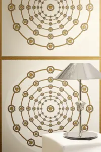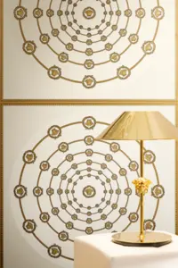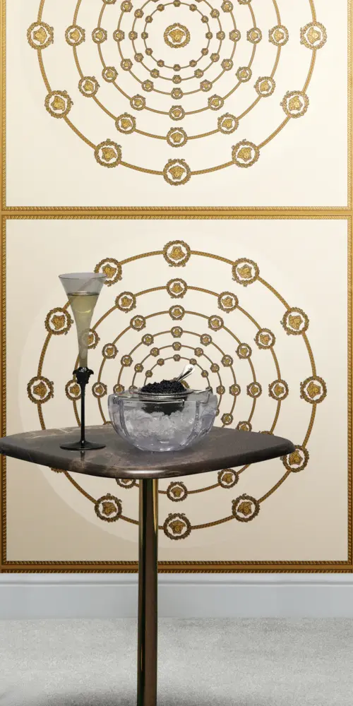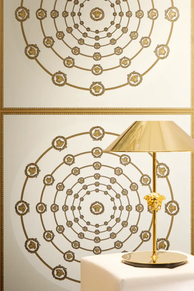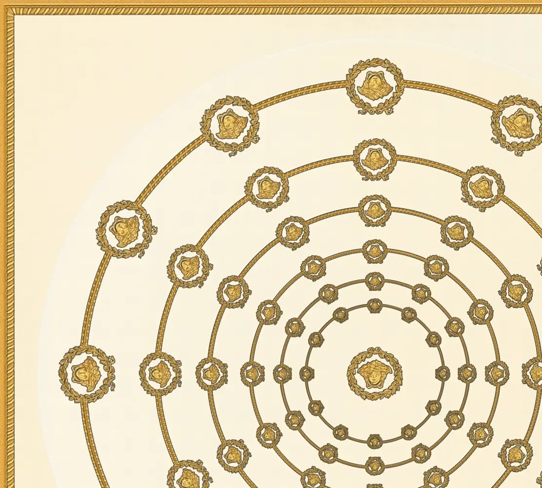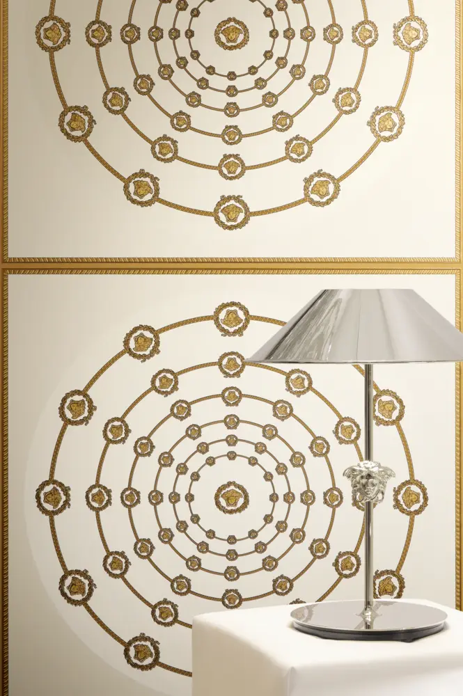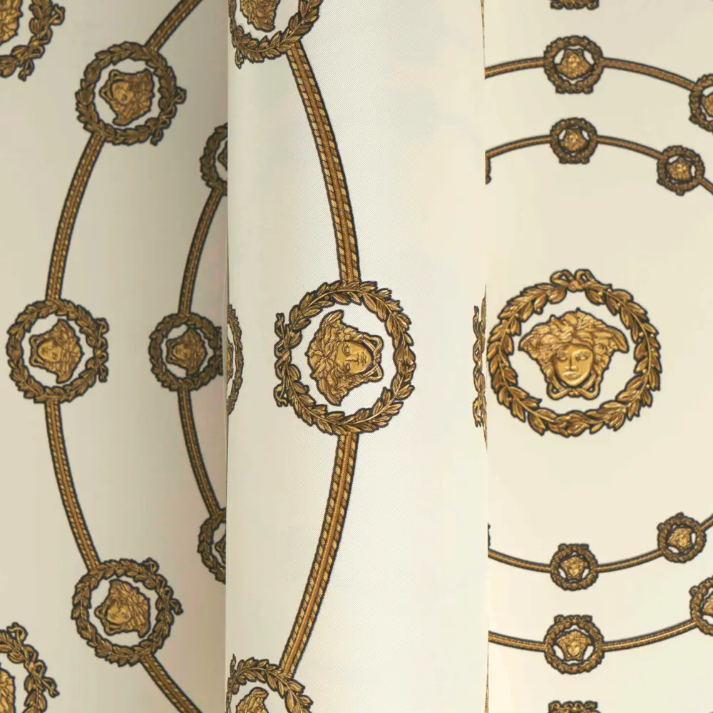 Barocke Elemente treffen auf geometrische Formen wie Quadrate und Kreise; ergänzt wird das Gesamtbild durch das charakteristische Medusakopf-Motiv. Der versetzte Rapport von 70 / 35 cm sorgt für ein dynamisches, harmonisches Musterbild, das großflächig ebenso wirkt wie als Akzentwand.