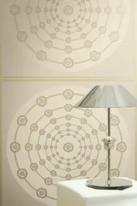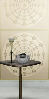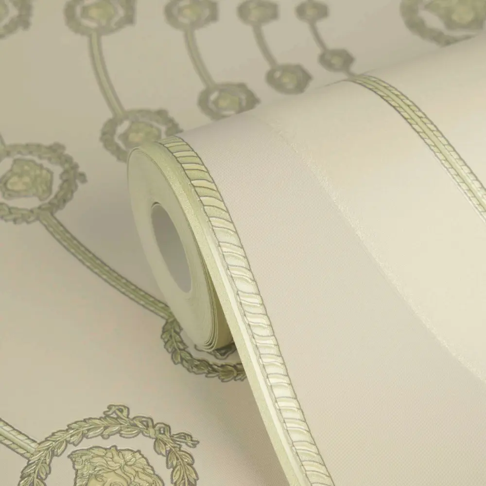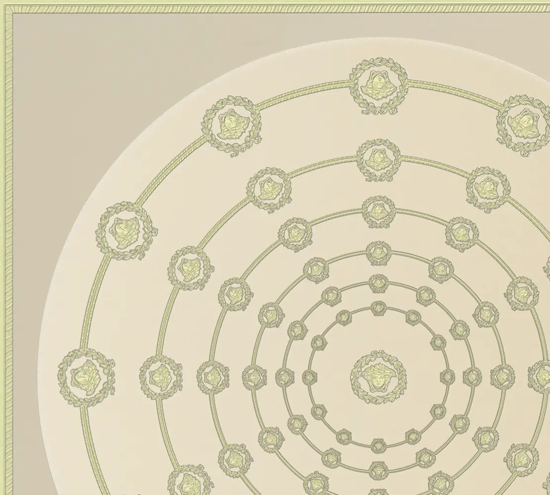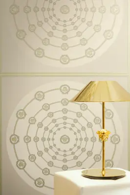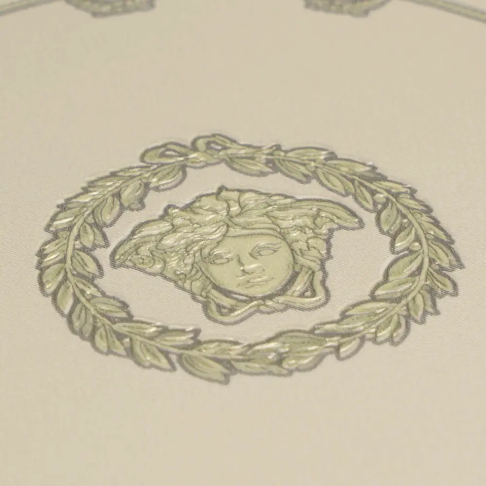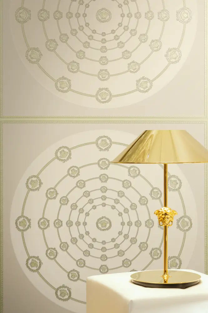 Das Design kombiniert barocke Elemente mit geometrischen Formen wie Quadraten und Kreisen und greift den charakteristischen Medusakopf als markantes Statement auf. Durch den versetzten Rapport von 70 / 35 cm entsteht ein lebendiges, hochwertiges Gesamtbild, das sowohl auf großen Wandflächen als auch als Akzent besonders wirkungsvoll ist.