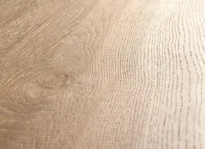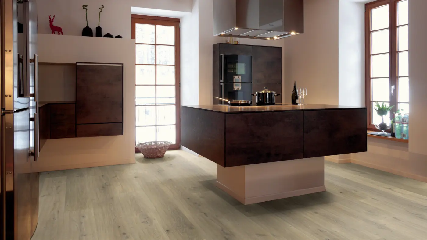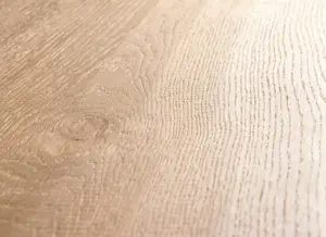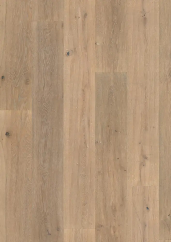 Der Boden besteht aus drei Schichten mit einer ca. 4 mm starken Echtholz-Deckschicht aus Eiche. Die Mittellage aus Fichte gewährleistet Formstabilität. Microfasen an allen Kanten betonen das großzügige Dielenformat. Mit einer Stärke von 15 mm und einer Breite von 260 mm bietet dieses Parkett ein hochwertiges Erscheinungsbild. Das QuickLock-Klicksystem ermöglicht eine einfache und sichere Verlegung, sowohl schwimmend als auch vollflächig verklebt. Die plankenlange Diele misst 2.200 mm.