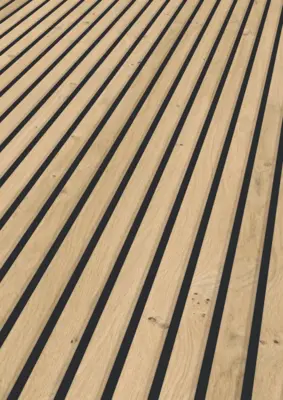 Die Paneele der ter Hürne Linear Edition in Eiche sand/mattschwarz verbinden eine natürliche Holzoptik mit einem modernen, mattschwarzen Akzent. Die matte, strukturierte Oberfläche sorgt für eine authentische Anmutung und unterstützt ein ruhiges, geradliniges Raumdesign an Wand und Decke.