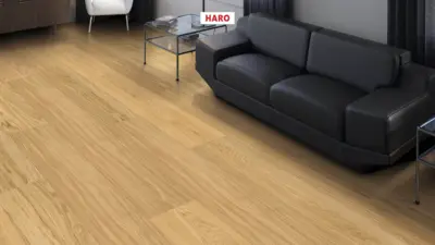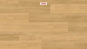 Der HARO Holz-Performanceboden Eiche Elegant Strukturiert im 2-Stab-Design vereint natürliche Holzoptik mit moderner Funktionalität. Die 4-seitige Fase betont das Dielenformat der eleganten Landhausdiele und schafft einen hochwertigen Gesamteindruck.