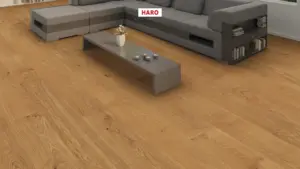 Die Dielen sind Teil der Serie 4000 Landhausdiele Plaza 240 von HARO. Jede Verpackungseinheit deckt 3,17 m² ab und enthält sechs Langdielen. Die Sortierung "ruhig" sorgt für eine gleichmäßige, harmonische Optik. Der Boden ist für die private Nutzung mit Stuhlrollen geeignet und besitzt keine integrierte Trittschalldämmung.