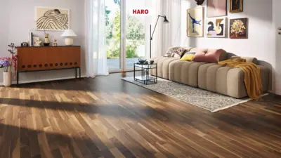 Der Parkettboden aus der HARO Serie 4000 Stab Allegro beeindruckt mit zeitloser Eleganz und einer hochwertigen Verarbeitung. Die Sorte „Am. Nussbaum Favorit nD“ verleiht jedem Raum eine warme, edle Atmosphäre und bringt die lebhafte Maserung des amerikanischen Nussbaums stilvoll zur Geltung. Die matte Lackierung sorgt für eine angenehme Haptik und einen natürlichen Look.